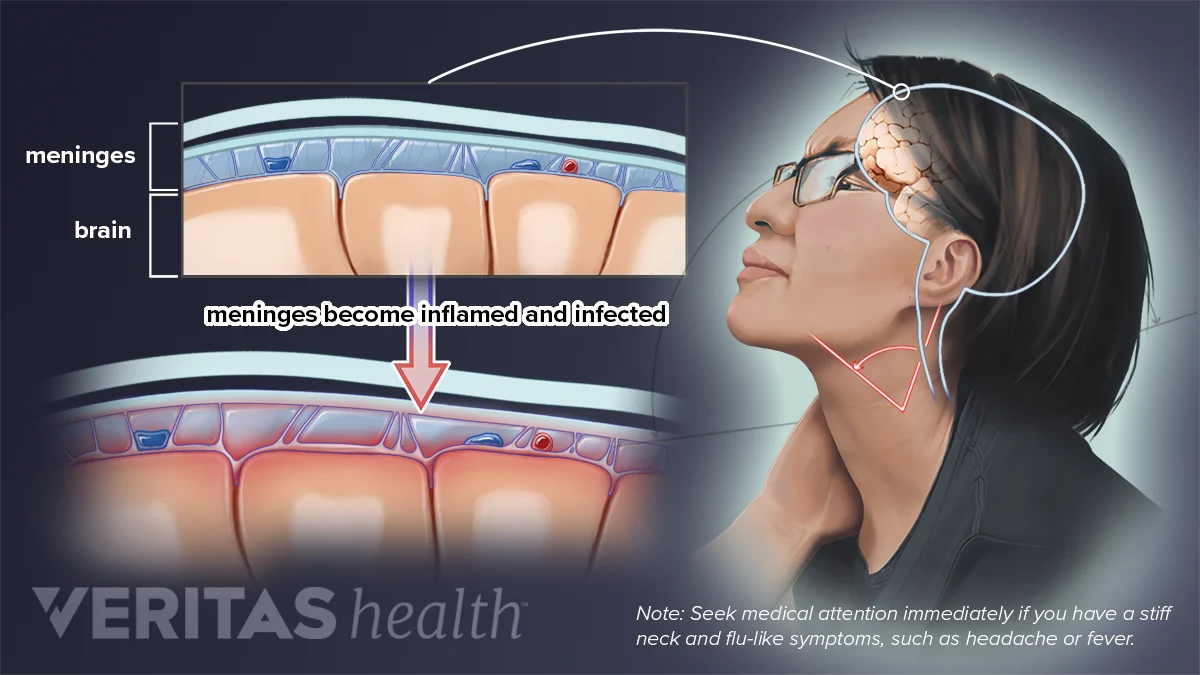 Meningitis, in its most dangerous form, is a bacterial infection that causes inflammation in the brain and spinal cord. Early warning signs of meningitis may include a fever (high body temperature, chills, body aches), an intense headache, and an inability to flex the neck forward. A stiff neck doesn’t always occur when meningitis is present, so look for other possible symptoms, such as nausea, vomiting, and increased sensitivity to sound or light.