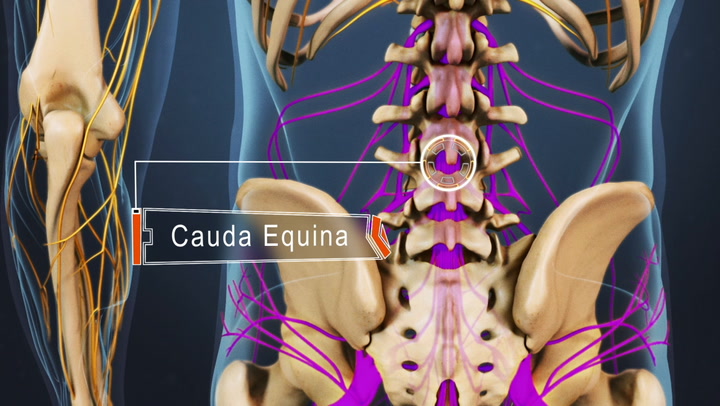 Compression of the cauda equina may lead to sciatic nerve pain felt on both sides of the body, and may be experienced as a sharp, hot pain felt down the backs of the thighs and possibly into the lower legs and feet.