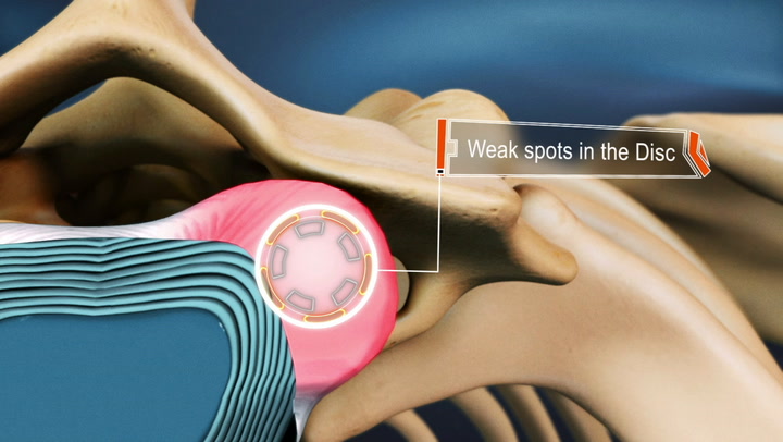 A herniated disc occurs when part or all of its protective outer layer tears and some of the nucleus pulposus leaks into the tear. A herniated disc typically causes the most pain when the nucleus pulposus, which contains inflammatory proteins, leaks out of the disc and onto a nearby nerve root. Less commonly, a herniated disc may leak onto the spinal cord.