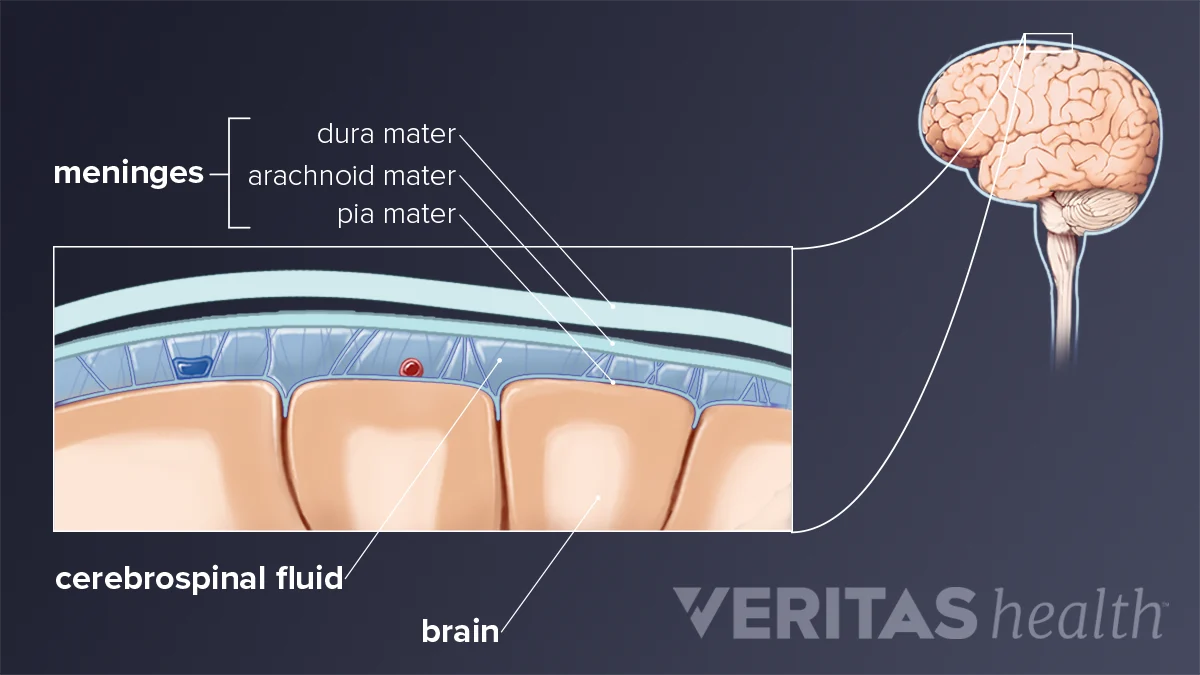 Most commonly in meningitis, the cerebrospinal fluid and its surrounding meninges—the arachnoid mater and pia mater—are infected and inflamed. While the dura mater may have little to no inflammation, its nerve fibers may become activated and contribute to neck pain and nuchal rigidity.