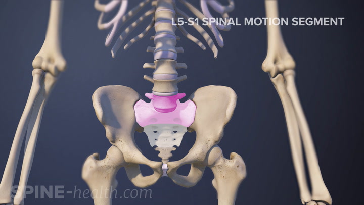 The L5-S1 spinal motion segment is at the bottom of the spine. This motion segment serves as the transition between the lumbar and sacral regions, and is also called the lumbosacral joint. Between the L5 and S1 vertebrae is a wedge-shaped intervertebral disc that provides flexibility and shock absorption.