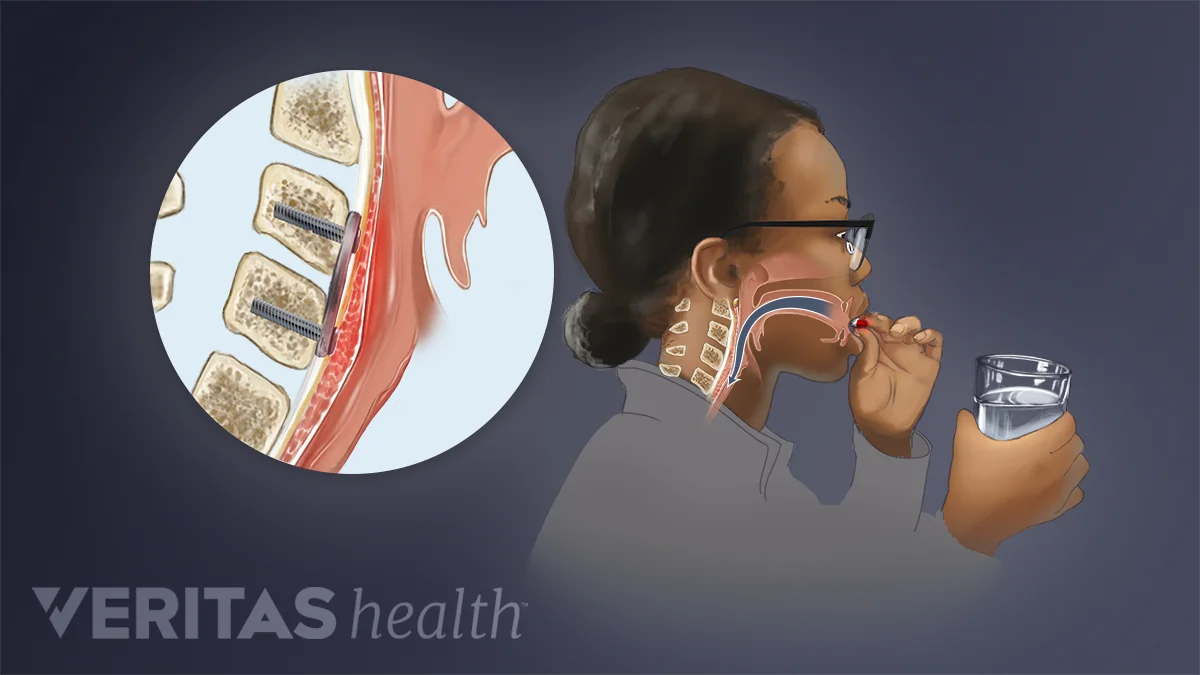 Post-surgical swelling or device issues can cause dysphagia after spine surgery.