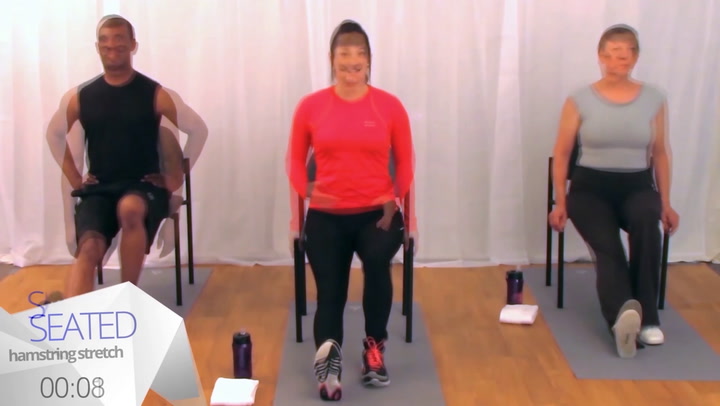 Adding hamstring stretches like the seated chair hamstring stretch to an exercise routine may help relieve some kinds of sciatica pain. This video illustrates how to do a seated chair hamstring stretch.