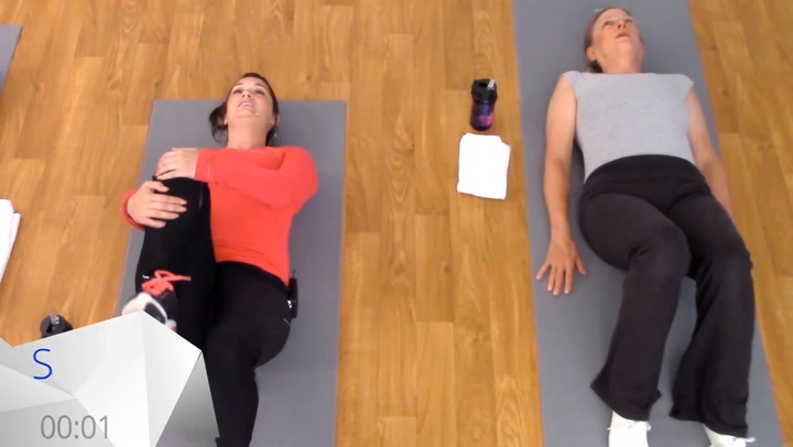 We’ll switch this out by bringing both feet back to the mat, and hug your left knee into your chest gently. Extend your right leg out.
