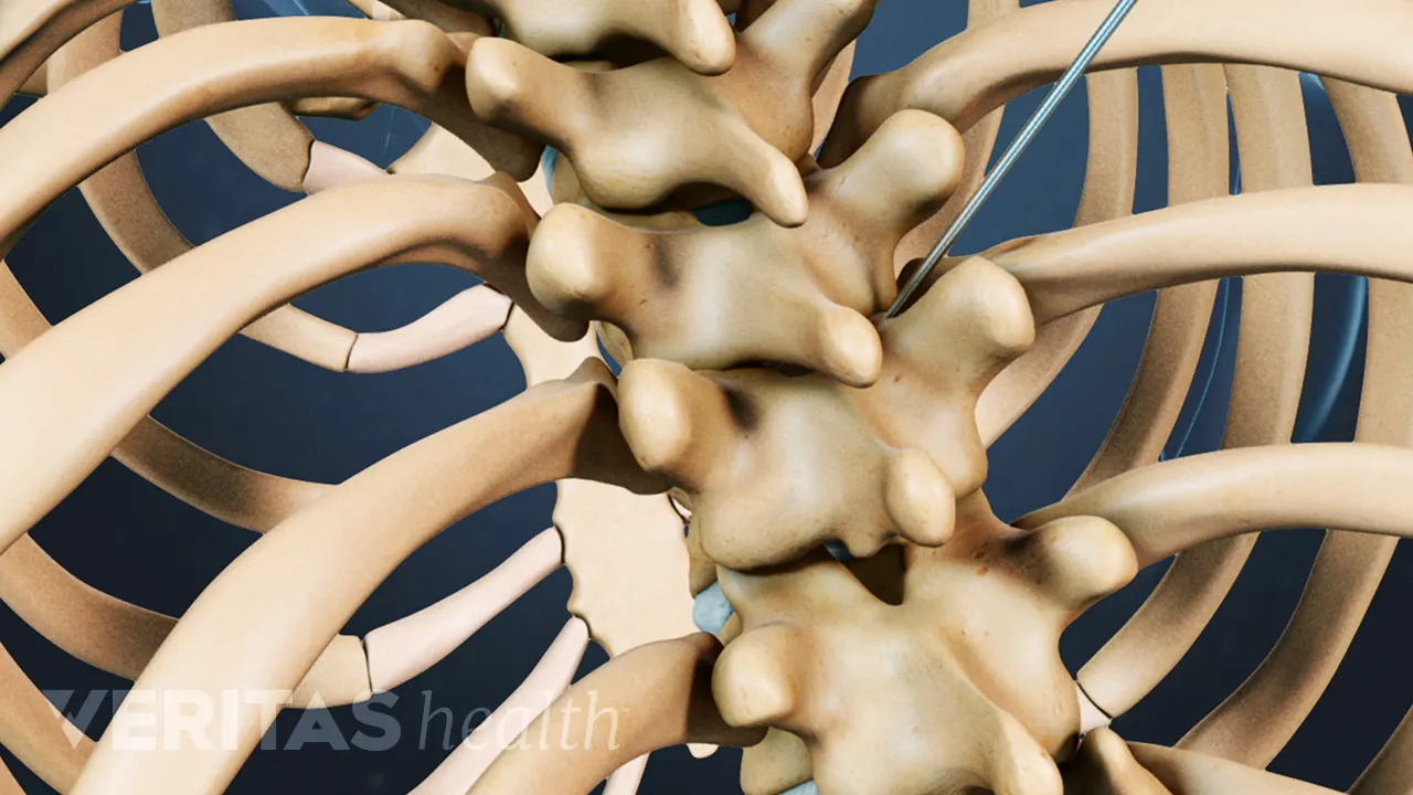- Using contrast-enhanced fluoroscopy, which displays x-ray images on a video monitor in real-time, a bone biopsy needle is guided into the fractured vertebra through a small puncture in the skin. The fluoroscopy is necessary for positioning the needle inside the vertebral compression fracture without damaging a nearby critical structure, such as the spinal cord.