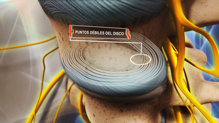 Una hernia de disco se produce cuando se desgarra la parte externa de un disco invertebral y se filtra la parte interna. La parte interna del disco que sale puede irritar o comprimir los nervios que se encuentran alrededor, lo que hace que el dolor se irradie. Un disco invertebral actúa como un amortiguador de golpes entre las vértebras de la columna, y permite que la columna vertebral se mueva. La parte externa durable de un disco, llamada anillo fibroso, sirve para contener la parte interna blanda del disco, el núcleo pulposo. La mayoría de las hernias de disco se producen en la región lumbar de la columna vertebral. Cualquier contacto entre los nervios y las proteínas inflamatorias que se encuentran en el núcleo del disco, o la presión del disco en sí sobre los nervios en la parte baja de la columna vertebral pueden provocar dolor, entumecimiento, hormigueo o debilidad que se irradian por la pierna. Estos síntomas se denominan ciática o radiculopatía lumbar. Cuando se produce una hernia de disco en la región cervical de la columna vertebral, puede hacer que el dolor se irradie por el hombro a los brazos y los dedos, y también puede causar síntomas neurológicos. Es relativamente poco frecuente que se produzca una hernia de disco en la región torácica de la columna vertebral. Cuando esto sucede, frecuentemente se siente dolor en la parte alta de la espalda y a veces este se irradia al pecho y al estómago. Cuando se forma una hernia en un disco cervical o torácico en el área de la médula espinal, esta puede causar mielopatía o disfunción de la médula espinal. Los síntomas incluyen entumecimiento, pérdida de equilibrio, debilidad en las extremidades inferiores, y pérdida del control de la vejiga. Una hernia de disco puede causar diversos síntomas neurológicos dolorosos. Es importante entender la causa subyacente de estos síntomas para poder tratar de manera eficaz una hernia de disco.