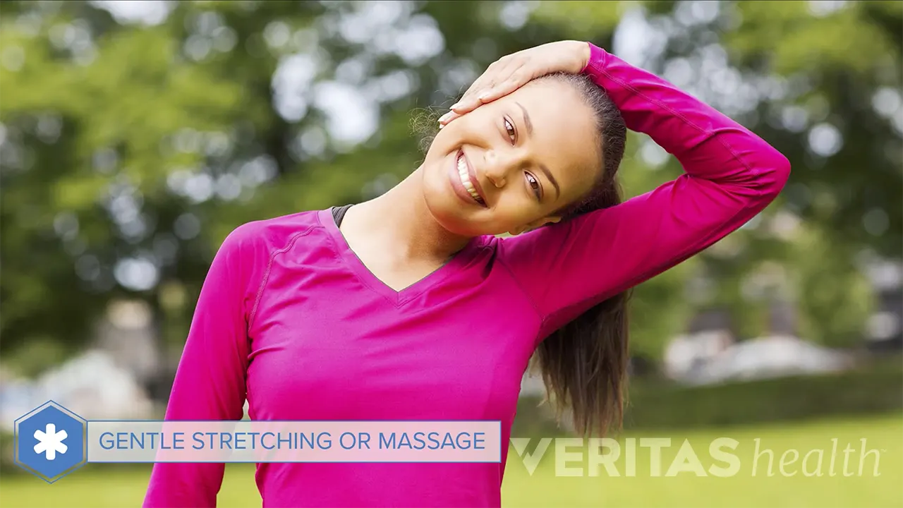 Gentle stretching or massage. If tolerated, try slowly stretching your neck to one side, and then the other. If you feel increased pain, you’re pushing too far. Some gentle stretching can help reduce tightness in the neck as you recover. You can also give your neck a light massage, or have a partner or willing friend do so. As long as the massage doesn’t increase pain, it can help relax muscles and improve blood flow.