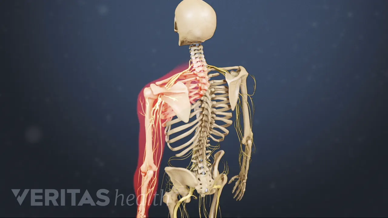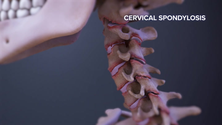 Degeneration in the cervical spine, also called cervical spondylosis, can involve cervical osteoarthritis, cervical degenerative disc disease, and other wear-and-tear conditions of the spine. As the spine eventually starts to degenerate with age, one or more intervertebral foramen (bony openings where the spinal nerves exit the spinal canal) may become smaller, called foraminal stenosis. With less room, a spinal nerve may become compressed or inflamed, causing pain to radiate from the neck down into the shoulder.